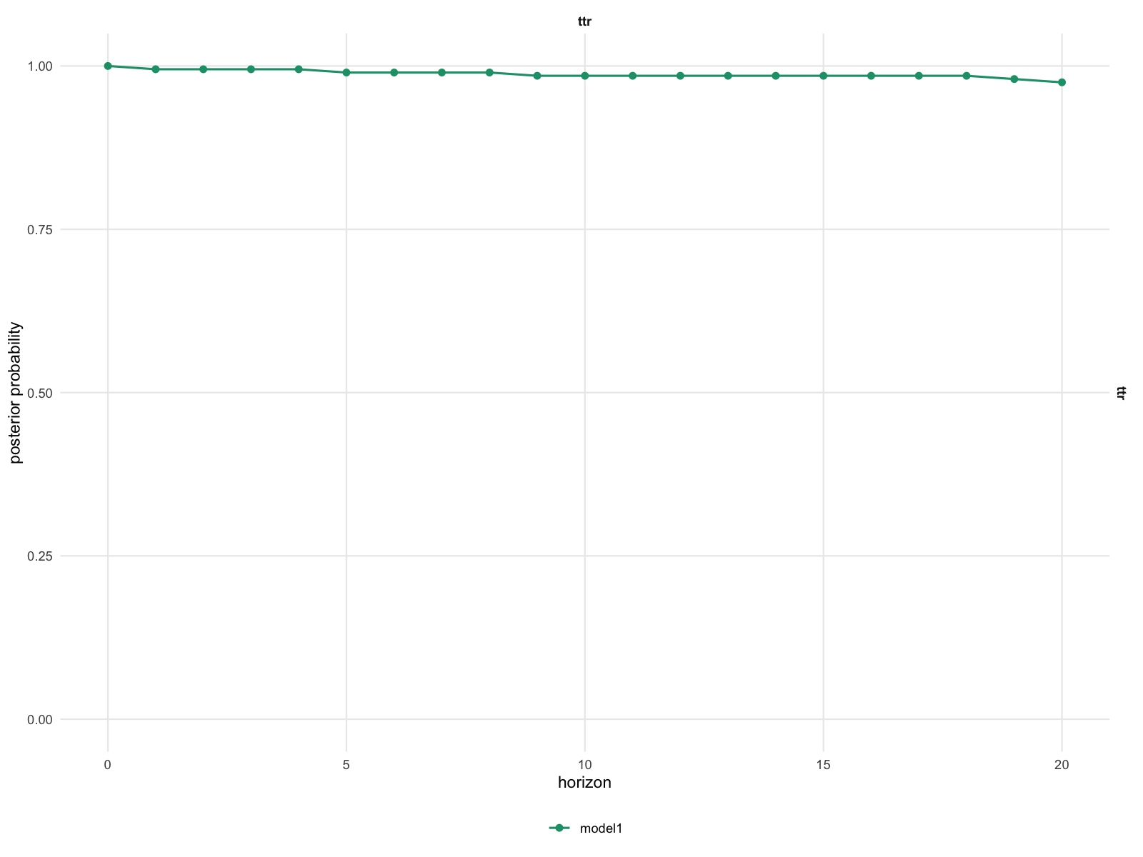 as_kable(h_base, digits = 2, preset = "compact")| Model | Variable | Shock | Horizon | Relation | Posterior probability | Mean gap | Median gap | Lower gap | Upper gap |